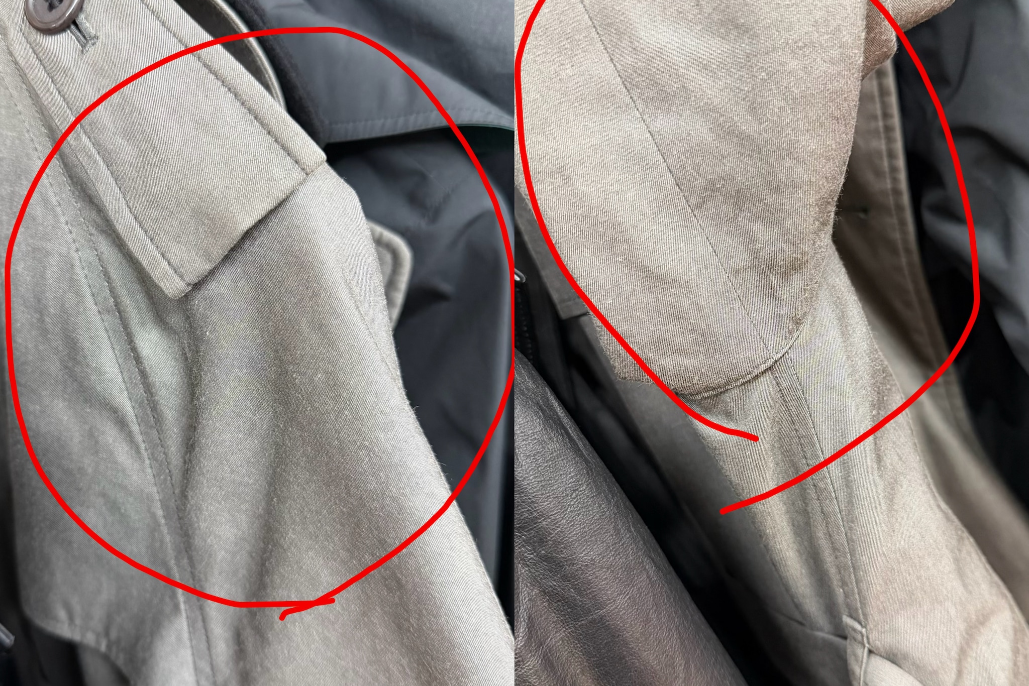 通常、トレンチコートやステンカラー(バルマカン)コートの袖は、2つのパーツを縫い合わせた「二枚袖」構造になっています。